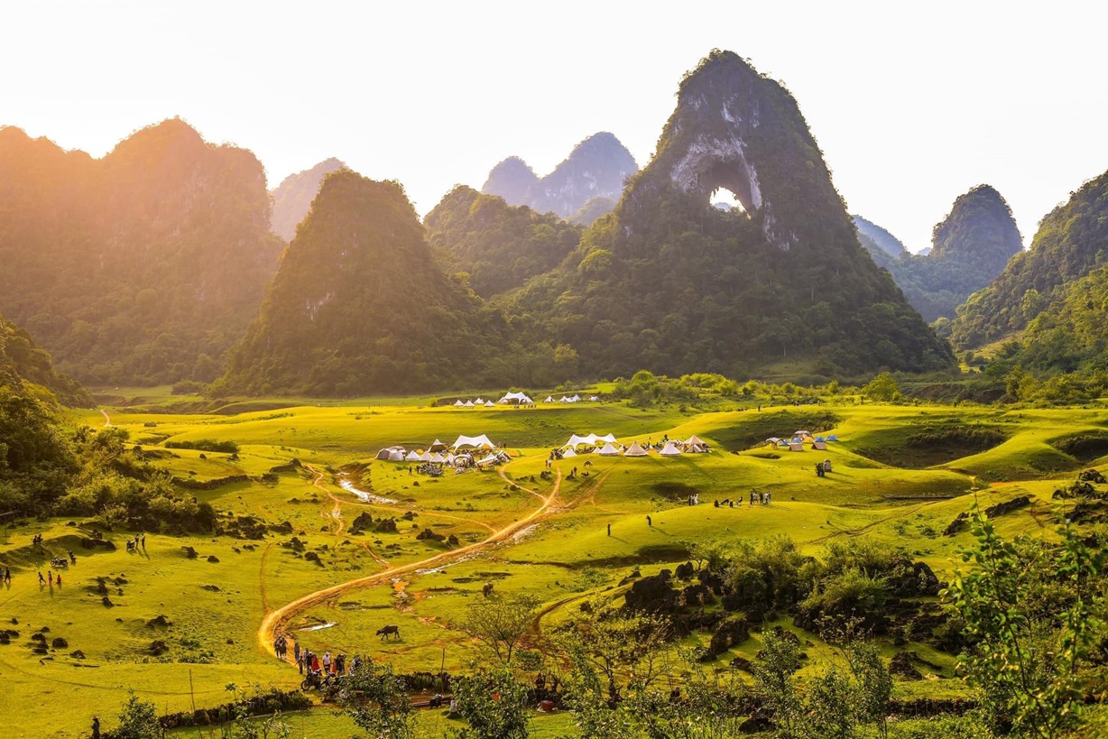 Also known as Nui Thung, this mountain is named for the giant circular hole near its summit, resembling an angel’s eye. Reaching the area feels like discovering a hidden valley, surrounded by jungles, rolling hills, and a tranquil lake reflecting the mountain’s “eye” above.